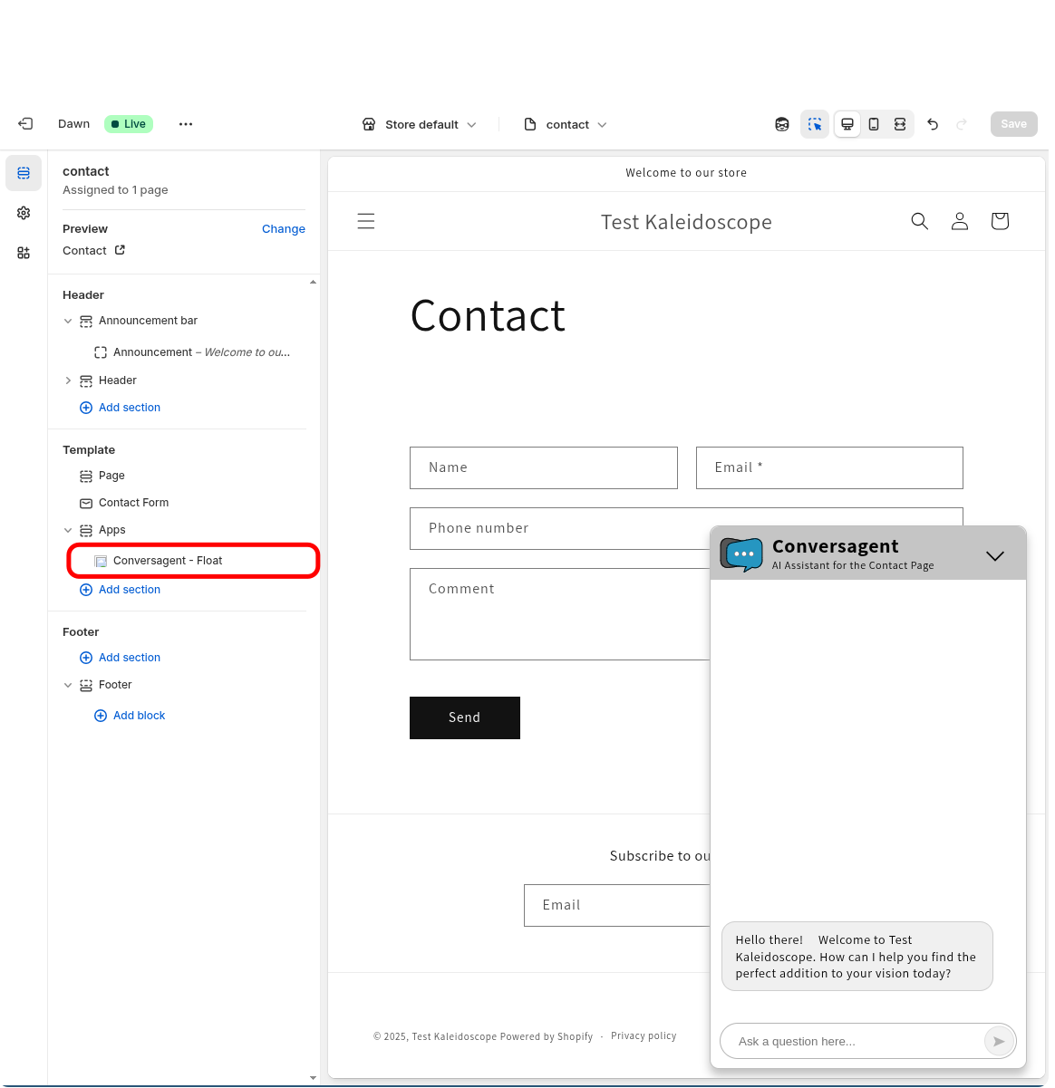 For example, you could set up Conversagent as a floating popup on your Home page, and as an embedded chatbot on your Product pages. To do this, simply add the “Conversagent – Floating” block to your Home page template, and the “Conversagent – Embed” block to your Product page template.